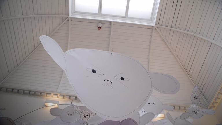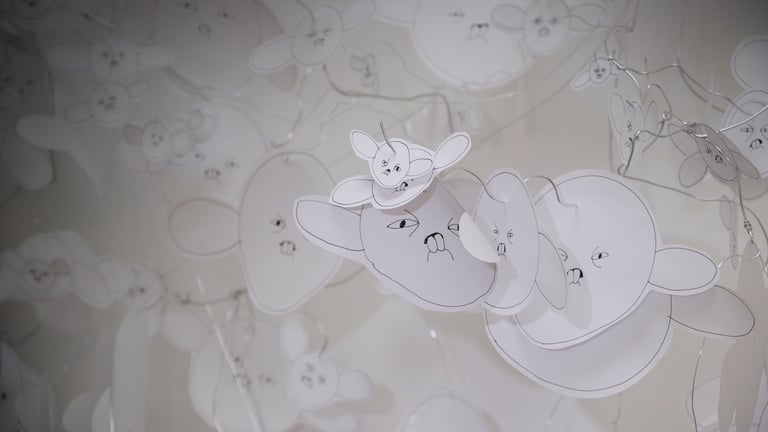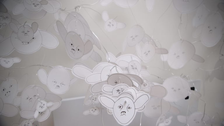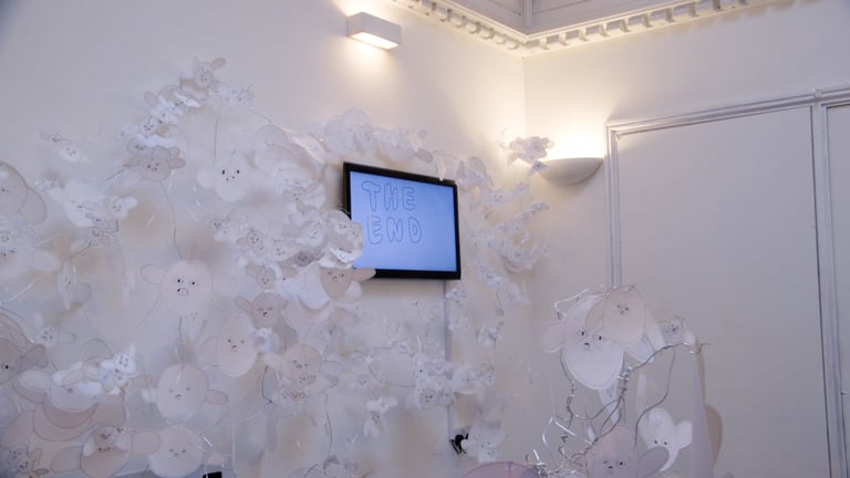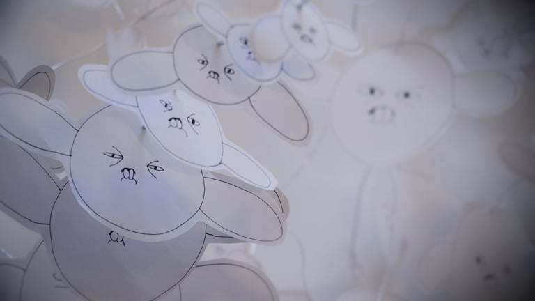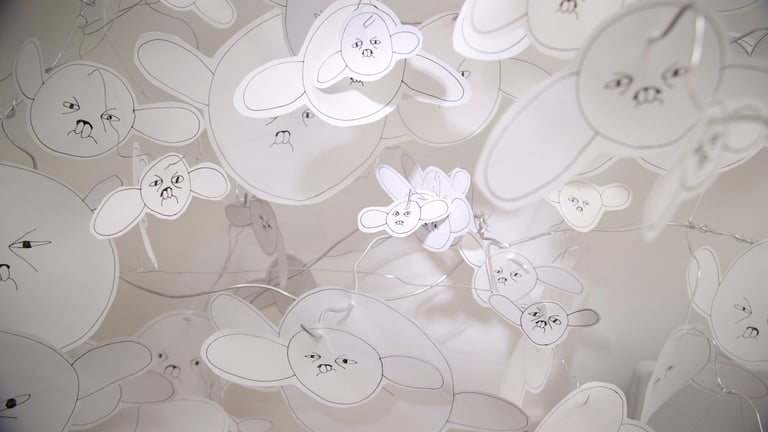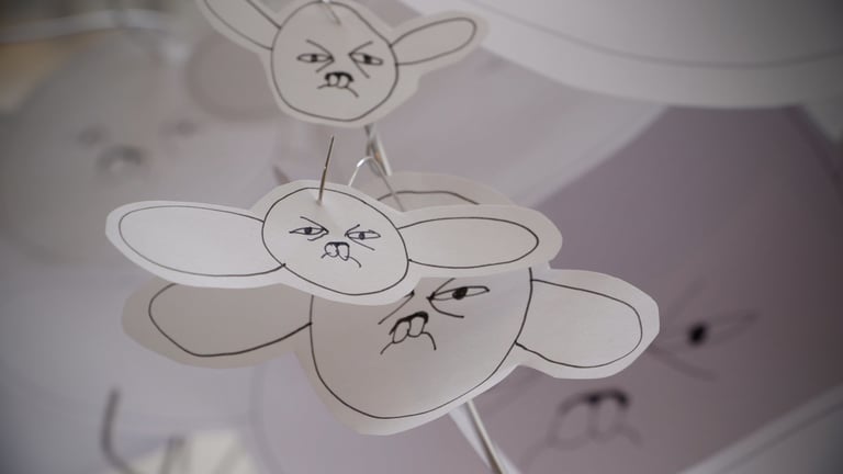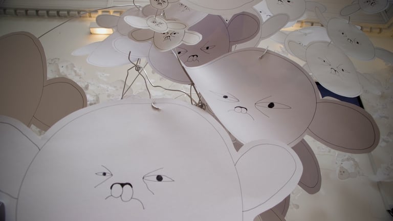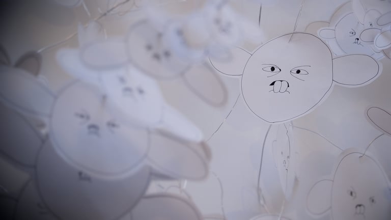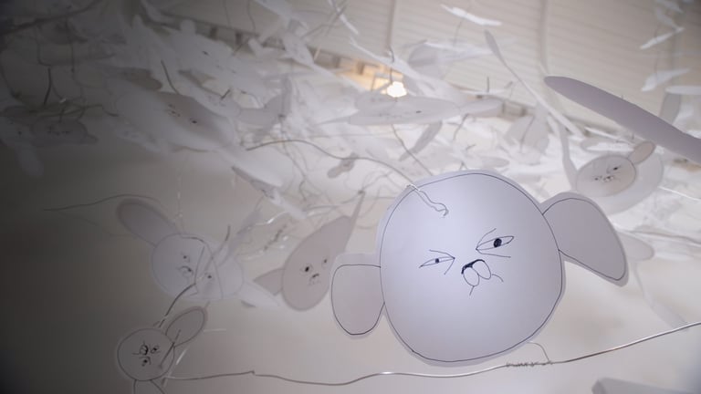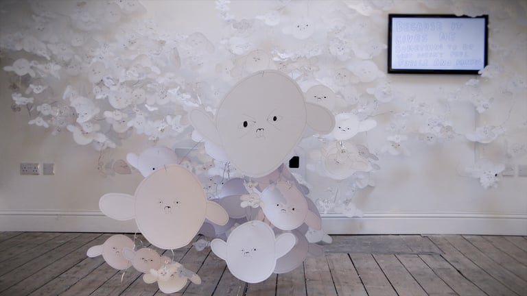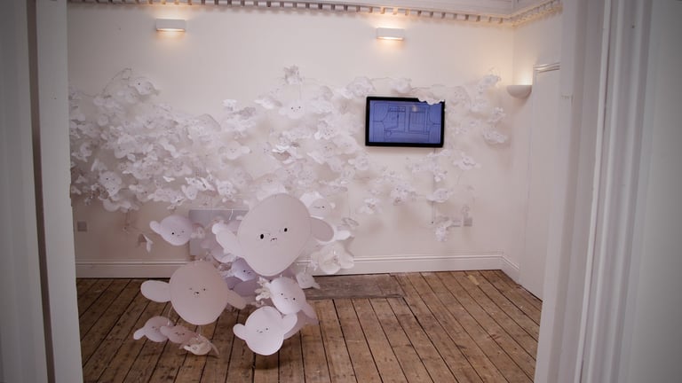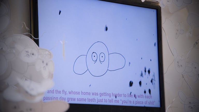 'FLY ON THE WALL' was an installation commissioned by Signal Film and Media, Barrow-in-Furness, as part of their TIDAL exhibition. It featured an animation and a sculptural swarm of over 500 hand-drawn disgruntled flies. In the animation, I present short 'episodes' from a narrative in which a girl is plagued by a fly on the wall that comes to life and judges her domestic and everyday habits.